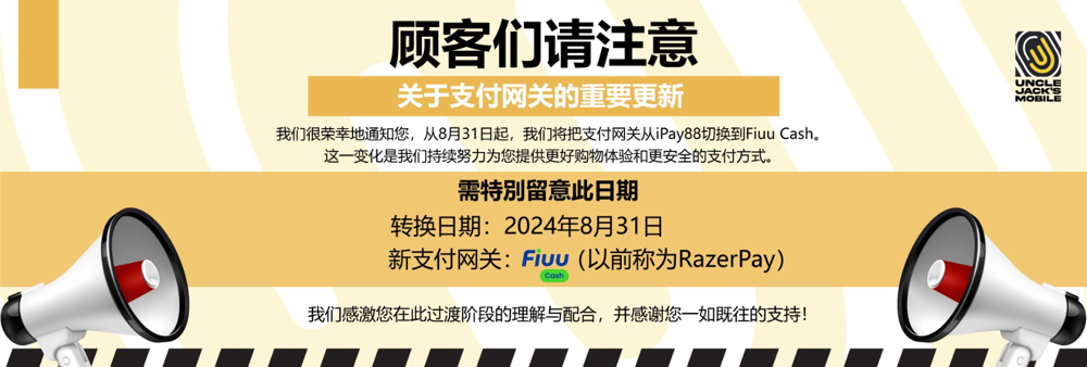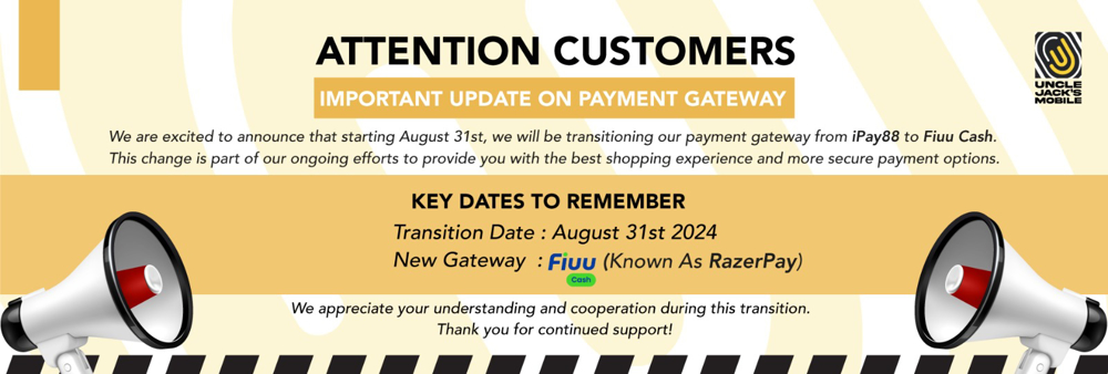 Kami teruja untuk mengumumkan bahawa mulai 31 Ogos, kami akan menukar gerbang pembayaran kami daripada iPay88 kepada Fiuu Cash. Perubahan ini adalah sebahagian daripada usaha berterusan kami untuk menyediakan pengalaman membeli-belah yang terbaik dan pilihan pembayaran yang lebih selamat.
